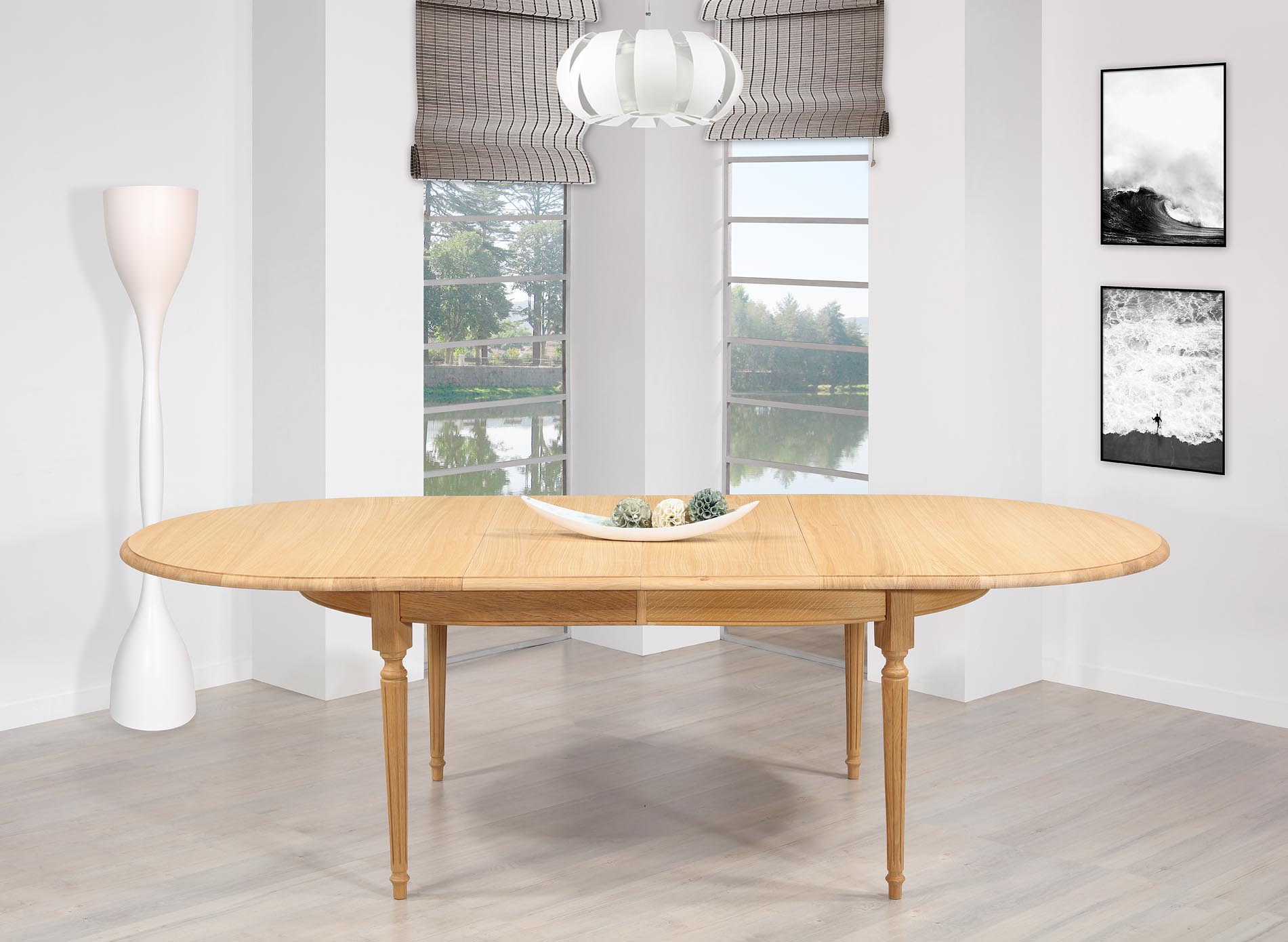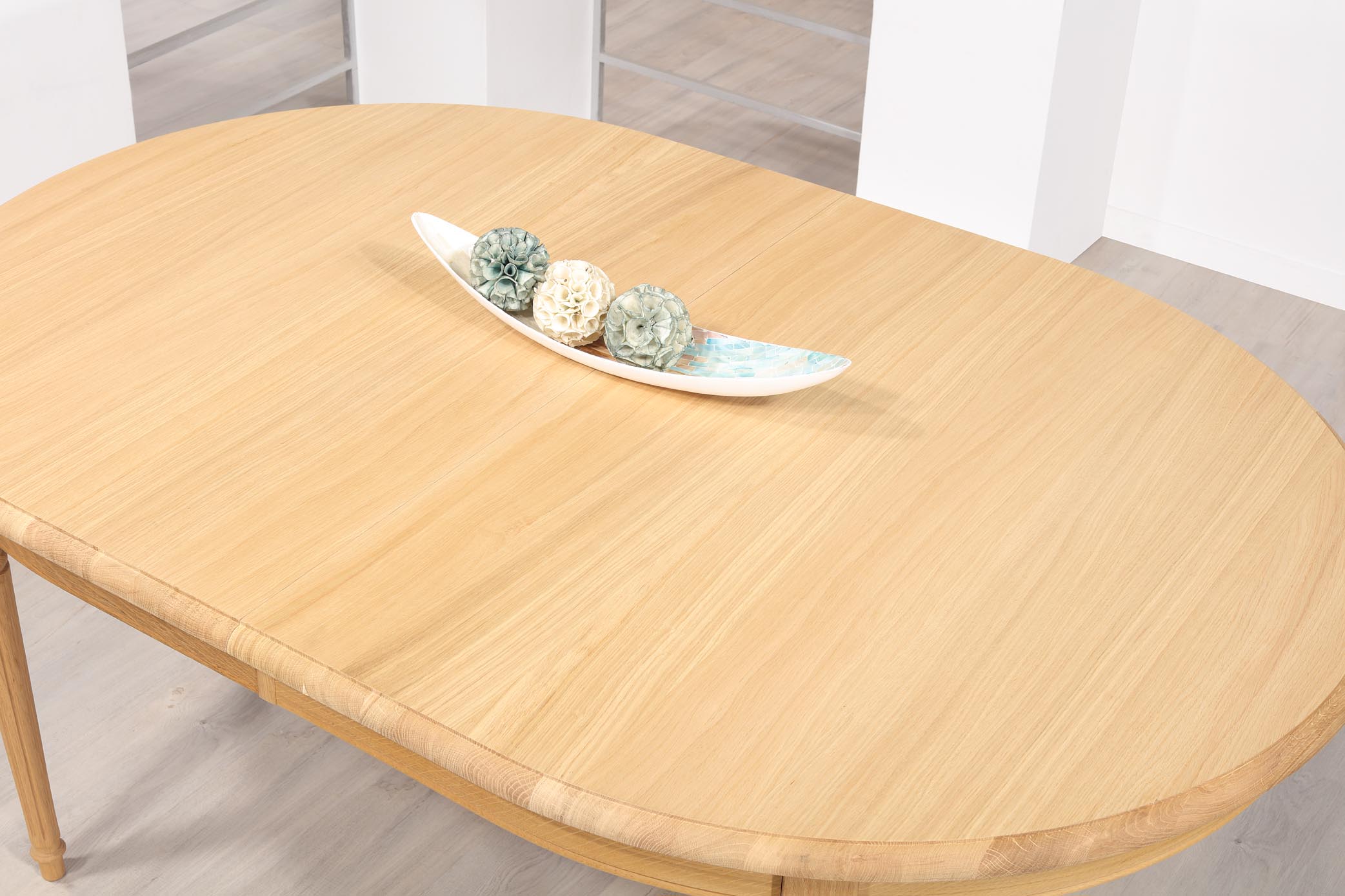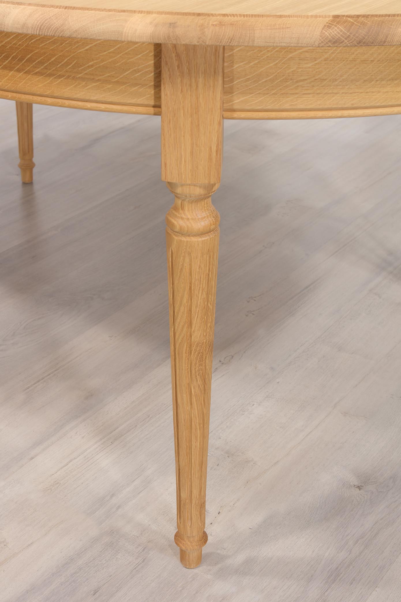 Table ovale 180x120 réalisée en Chêne Massif de style Louis XVI 2 allonges de 39 cm Ouverture du plateau synchronisée SEULEMENT 1 DISPONIBLE